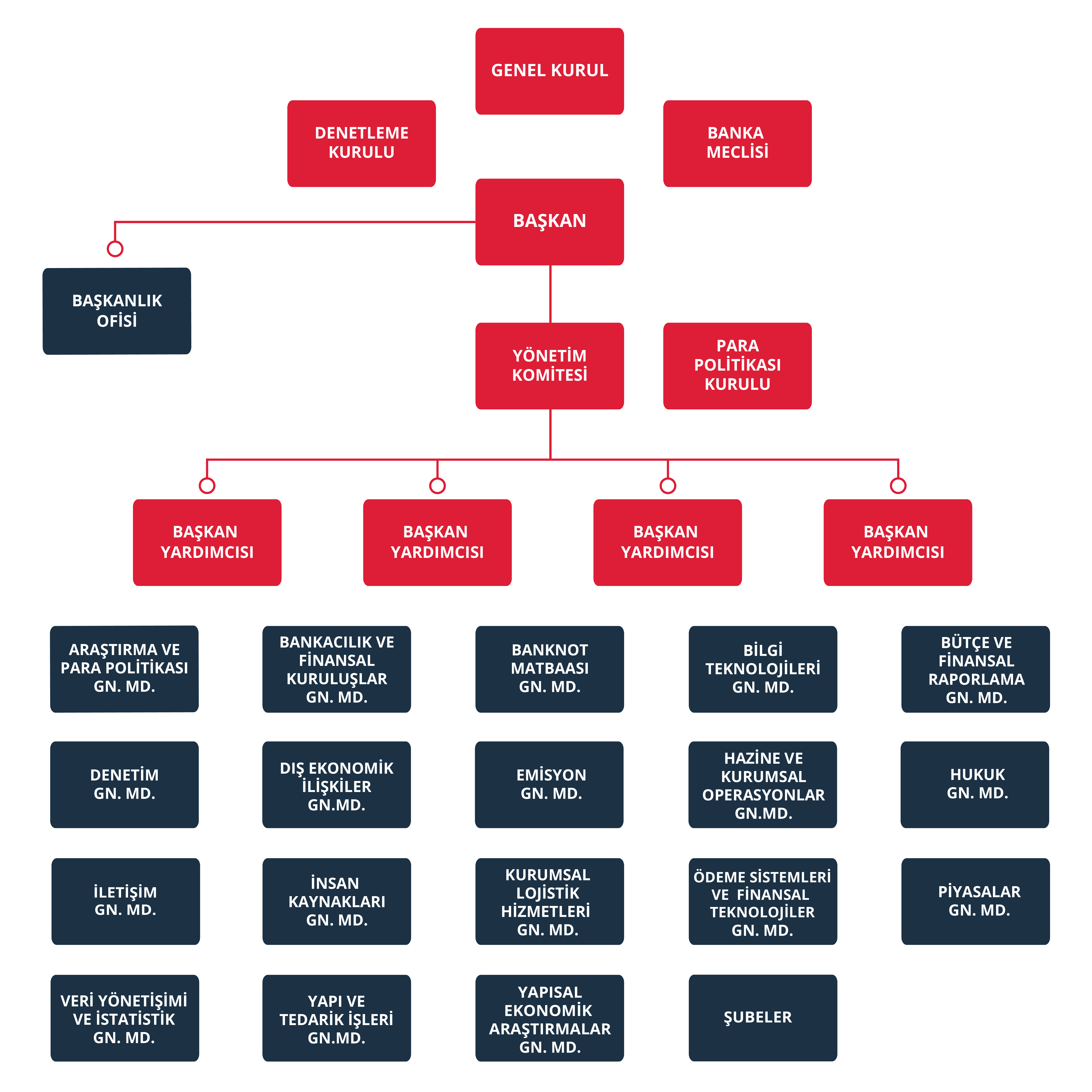 Merkez Bankası 11 Haziran 1930 tarihinde bir anonim şirket olarak kurulmuştur. Banka, İdare Merkezi, Banknot Matbaası ve Şubelerden oluşmaktadır. Bankanın İdare Merkezi Ankara’dadır. On dokuz Genel Müdürlük ve yirmi bir Şubeden oluşan Bankanın, 2025 yılı sonu itibarıyla 4.123 çalışanı bulunmaktadır.
