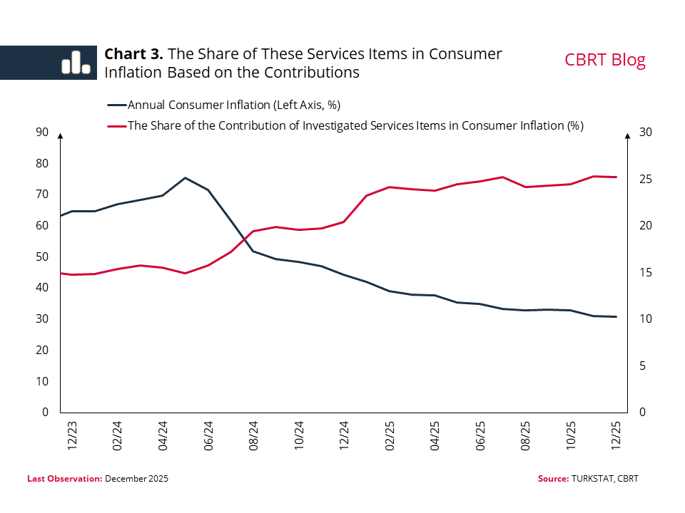 In the following section, we calculate the contribution of the aforementioned service items to consumer inflation. The contribution of these three groups to consumer inflation peaked at 11.3 percentage points in the May–June 2024 period (Chart 2). Although the contribution declined to 7.8 percentage points by the end of 2025, it remains high. By the end of the year, the contribution of rents, education, and locally provided and relatively less competitive services items to inflation was 4.2, 1.5, and 2.1 percentage points, respectively. The services investigated account for approximately a quarter of consumer inflation (Chart 3). Moreover, despite the decline in consumer inflation, the contribution of these three groups to inflation remained high throughout 2025, leading to significant inertia in the disinflation process. In 2025, the contributions of locally provided and relatively less competitive services items to inflation remained unchanged. Indeed, rent and education inflation declined by 44 and 25 percentage points, respectively, while the fall in inflation of local/relatively less competitive services items was limited to 2 percentage points.