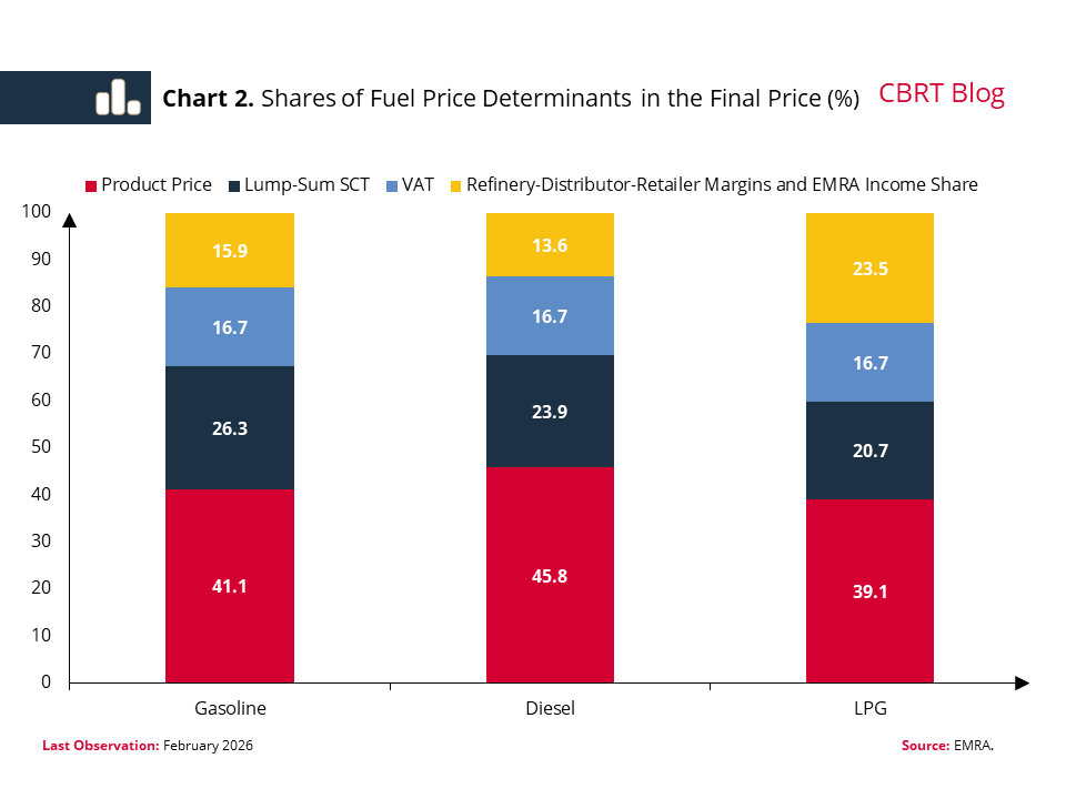 The sliding scale system functions as a mechanism that partly offsets the impact of changing costs on fuel prices through tax adjustments, thereby easing price volatility. At times of elevated prices in gasoline, diesel or LPG products, this mechanism is used to reduce the tax component, hence to limit the increase in final fuel prices. The fact that fuel prices are the sum of different components allows the mechanism to function through the tax item.[2] In fact, as of February 2026, the approximate shares of lump-sum SCT amounts were 26% for gasoline, 24% for diesel, and 21% for the LPG (Chart 2).