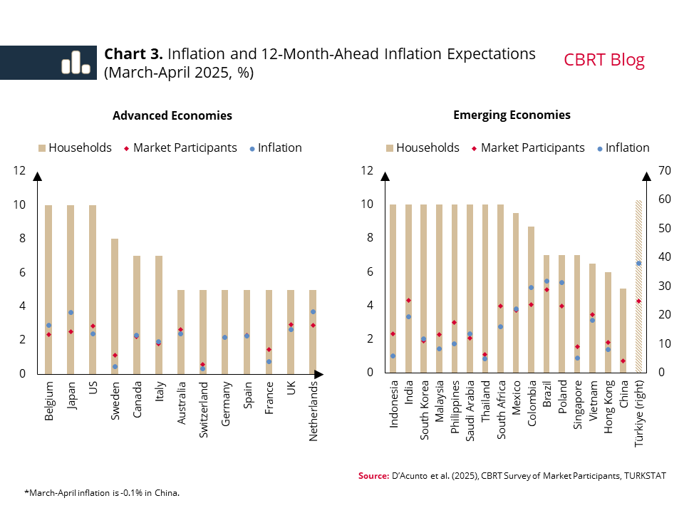 The divergence in inflation expectations among different economic actors — most notably households and market participants — is a phenomenon observed in other countries as well (Chart 3).[1] Household expectations in advanced and emerging economies are observed to be well above actual inflation and professional forecasts. Household expectations, which stand at 10%, are particularly striking in many countries where inflation has remained at 2% or below for a long time.