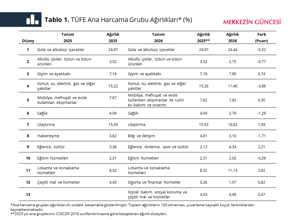 Yeni sınıflama, güncel tüketim yapısını daha iyi yansıtacak şekilde kategori sayısını artırırken, mal ve hizmet ayrımını da netleştirdi. Ayrıca çevrim içi hizmetler (paket yemek servisi taşıma ücreti vb.) ve yeni tüketim biçimleri (elektrikli otomobillerin şarjı, çamaşır kurutma makinası vb.) de kapsama dâhil edildi. Buna ek olarak, harcama kalemleri eski grup sayısı olan 12 yerine 13 ana grup altında yeniden düzenlendi (Tablo 1). Heterojen yapısı sebebiyle “Çeşitli Mal ve Hizmetler” ana grubunda yer alan bazı kalemler ayrıştırılarak “Sigorta ve Finansal Hizmetler” ve “Kişisel Bakım, Sosyal Koruma ve Çeşitli Mal ve Hizmetler” başlıkları altında yeniden tanımlandı. Bunun yanı sıra “Haberleşme” ana grubunun kapsamı genişletilerek “Bilgi ve İletişim”, “Eğlence ve Kültür” ana grubu ise “Eğlence, Dinlence, Spor ve Kültür” olarak yeniden sınıflandırıldı.
