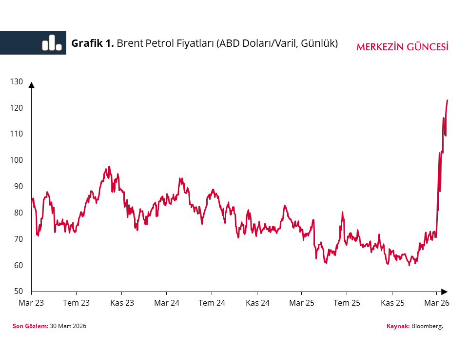 Akaryakıt fiyatları; ürün fiyatı, toptancı-dağıtıcı-bayi marjları, Enerji Piyasası Düzenleme Kurumu (EPDK) gelir payı ve vergilerin toplamından oluşuyor. Ürün fiyatının temel belirleyicileri ise uluslararası petrol fiyatları, rafine marjları ve döviz kuru. Son dönemde yaşanan jeopolitik gelişmeler ile birlikte uluslararası petrol fiyatları hızlı bir şekilde yükseldi (Grafik 1). 4 Mart 2026 tarihli Cumhurbaşkanı Kararı ile eşel mobil uygulaması devreye alındı ve akaryakıt ürünlerine uygulanan Özel Tüketim Vergisi (ÖTV) tutarlarında değişikliğe gidildi.[1]