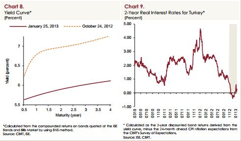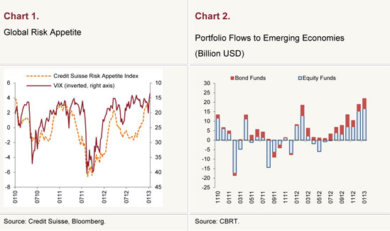 Now, I would like to convey the main messages of the report. Firstly, I will touch upon the global economy and then move on to the monetary policy. The last quarter of 2012 was marked by an improvement in the risk appetite (Chart 1). Concrete steps taken towards the resolution of the Euro area problems as well as the favorable news regarding the US and Chinese economies were the leading developments that fed into the risk sentiment. On the other hand, quantitative easing policies were sustained amid the persisting sluggish growth outlook in advanced economies. Continued monetary easing at a global scale accompanied by increased risk appetite led to an acceleration in portfolio flows towards emerging economies (Chart 2). We are of the opinion 3 that all these developments once again highlighted the importance of a flexible monetary policy framework.