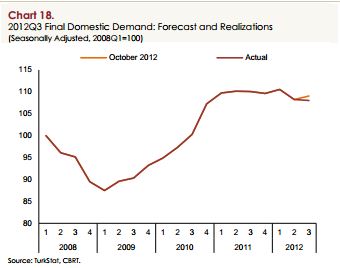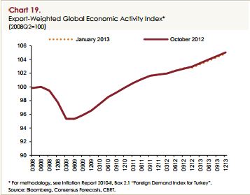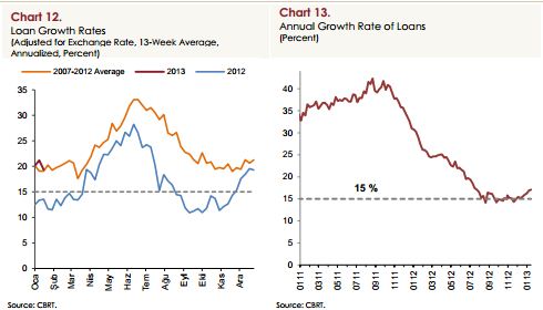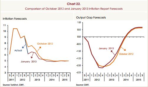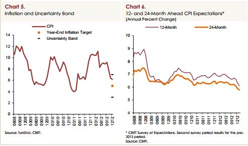 We can summarize the main message of the forecast regarding the monetary policy as follows: a cautious monetary policy stance should be maintained to keep inflation close to the target at the end of 2013. It is important that the CBRT does not disregard excessive volatility in credit and exchange rates, for macro financial risks to be contained. It should be kept in mind that keeping credit growth at healthy and reasonable levels will support both price stability and financial stability. In fact, notwithstanding the recent faster-than-expected growth in credit, we envisaged that credit growth would hover around 15 percent.