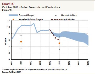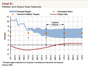 When forming our forecasts, we assumed that annual loan growth rate would hover around 15 percent and there would be no significant change in the real effective exchange rate. Accordingly, inflation is expected to be, with 70 percent probability, between 3.9 and 6.7 percent (with a mid-point of 5.3 percent) at the end of 2013, and between 3.1 and 6.7 percent (with a midpoint of 4.9 percent) at the end of 2014. We expect inflation to stabilize around 5 percent in the medium term (Chart 21).