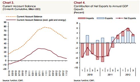 In this period of extraordinary global circumstances, the policy framework designed by the CBRT plays a great role in confining the adverse impacts of global shocks in Turkey. Particularly the year 2012 was marked by the fruitful implementation of our policy mix. Persisting global imbalances notwithstanding, we witnessed a healthier outlook composition of growth besides a more evident rebalancing process. As illustrated in the slide, the current account continued to improve (Chart 3) and the contribution of net exports to growth displayed a surge (Chart 4). I would like to put special emphasis on the contribution of both exports and imports, which proved positive, highlighting the effectiveness of the measures taken.
