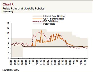 Having started to achieve the intended results regarding inflation and rebalancing, monetary policy has adopted a more accommodative stance since mid-2012. In this respect, the CBRT lowered its average funding rate gradually since June by increasing the liquidity injected to the market (Chart 7). Improved risk appetite and more effective use of the Reserve Options Mechanism (ROM) have allowed a gradual reduction in the upper bound of the interest corridor since September. Meanwhile, the liquidity provided for the market was further increased, driving overnight market rates close to lower bound of the corridor.