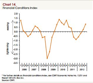 There is a risk of further acceleration in credit in the forthcoming period. Financial conditions index continued to ease with rapid capital inflows, improving credit supply conditions, and accommodative liquidity policy (Chart 14). This outlook necessitates a cautious stance against macro financial risks. Given these evaluations, I would like to remind that in its first monthly meeting of 2013, the Committee highlighted the faster-than- expected credit growth and signaled that macroprudential measures might be continued should this trend persist.