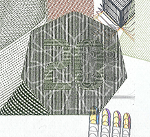 When held up to the light, front and back elements of the motif combine the form the denomination numeral.