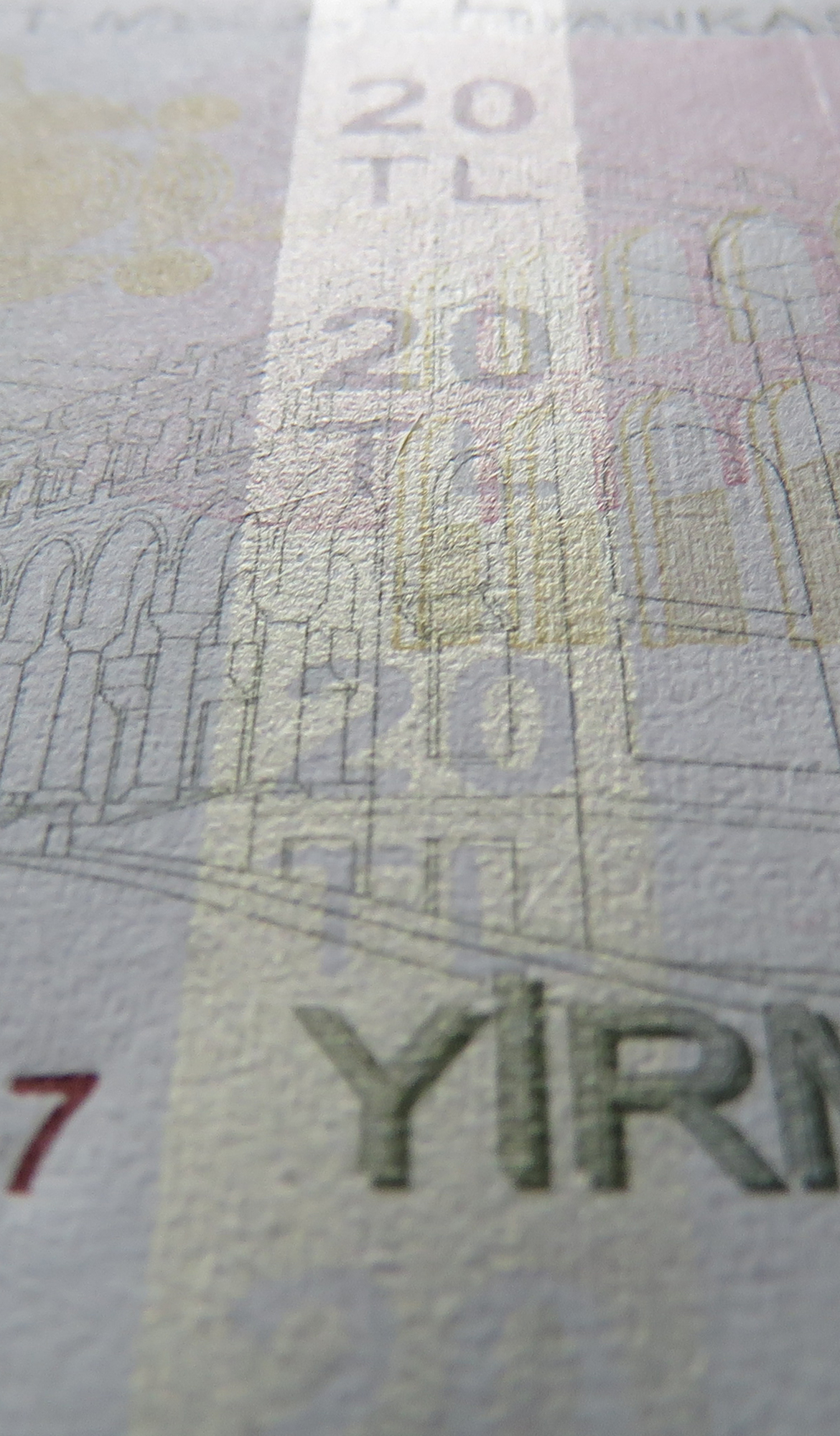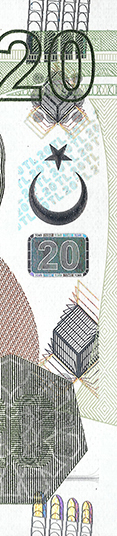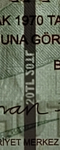 Gives different colour effects, shifting into a golden yellow. The denomination numeral "20" and the letters "TL" can be seen when the banknote is tilted.