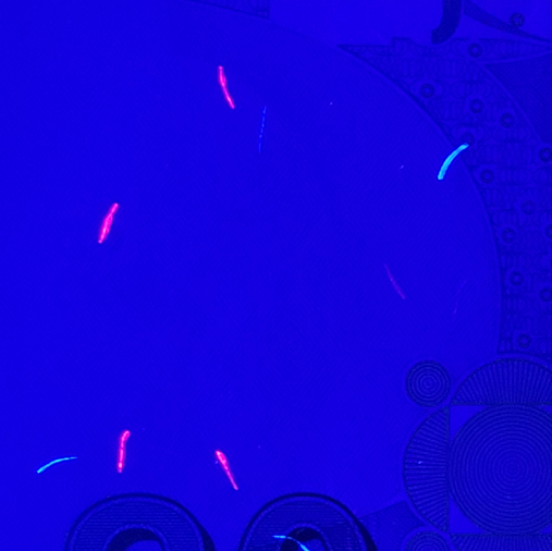 b) Fine fibres embedded in the banknote paper are not normally visible. These fibres glow in blue and red colours under UV light.