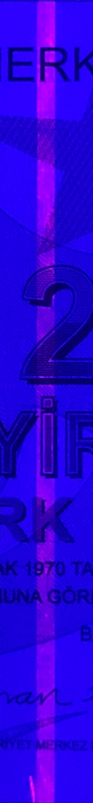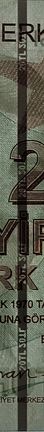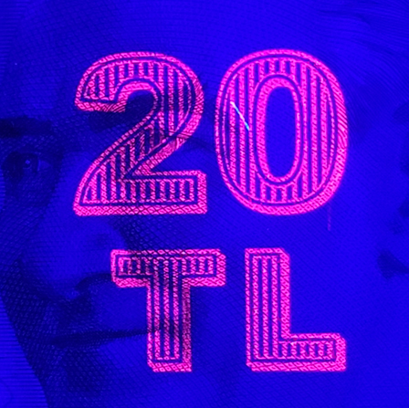 The foil is made up of various motifs that are in harmony with the note design. When looking at a banknote from various angles, these motifs display colourful and shiny reflections. "TL" letters in the rectangle change into the denomination numeral.