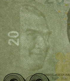 Reproduces the small version of the Atatürk's portrait located on the obverse side of the banknote and the denomination numeral "20". It can be seen from both sides when held up to the light.