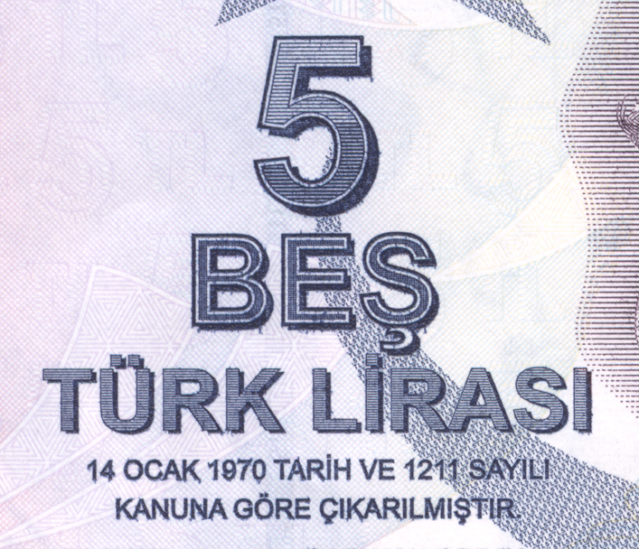 Embedded in the paper, the thread bears the letters "TL" and the denomination numeral "5". When holding a banknote to the light, the thread can be seen from both sides as a continuous line.