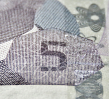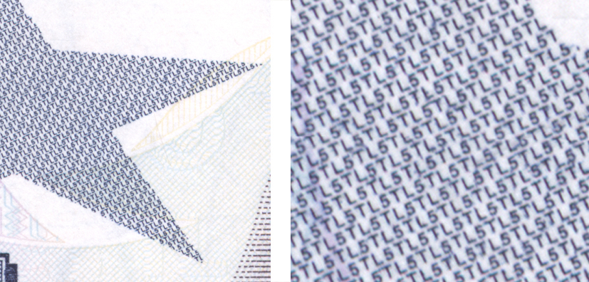 When held up to the light, front and back elements of the motif combine the form the denomination numeral.