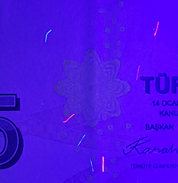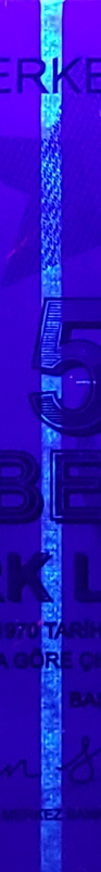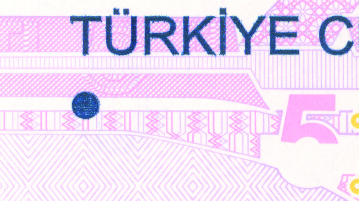 The letters "TCMB" on the bottom and top edges of the rectangle on the holographic stripe and "5 TL" within the crescent-star on the obverse side of the banknotes are printed in microletters.