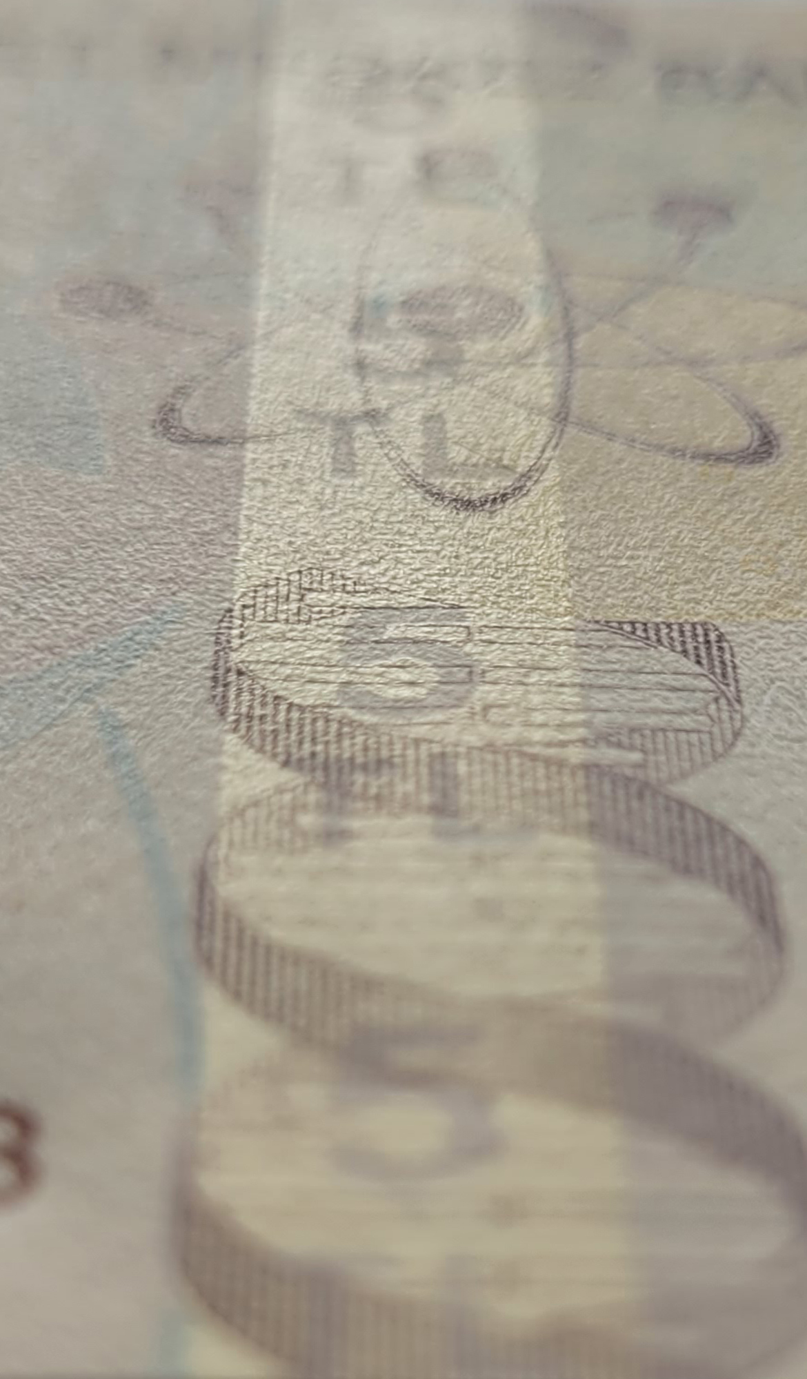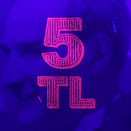 The foil is made up of various motifs that are in harmony with the note design. When looking at a banknote from various angles, these motifs display colourful and shiny reflections. "TL" letters in the rectangle change into the denomination numeral.