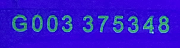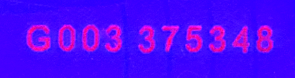 e) The serial and sequence numbers printed in "red" will glow in "bright and shiny red" and those printed in "black" in a "yellowish green".