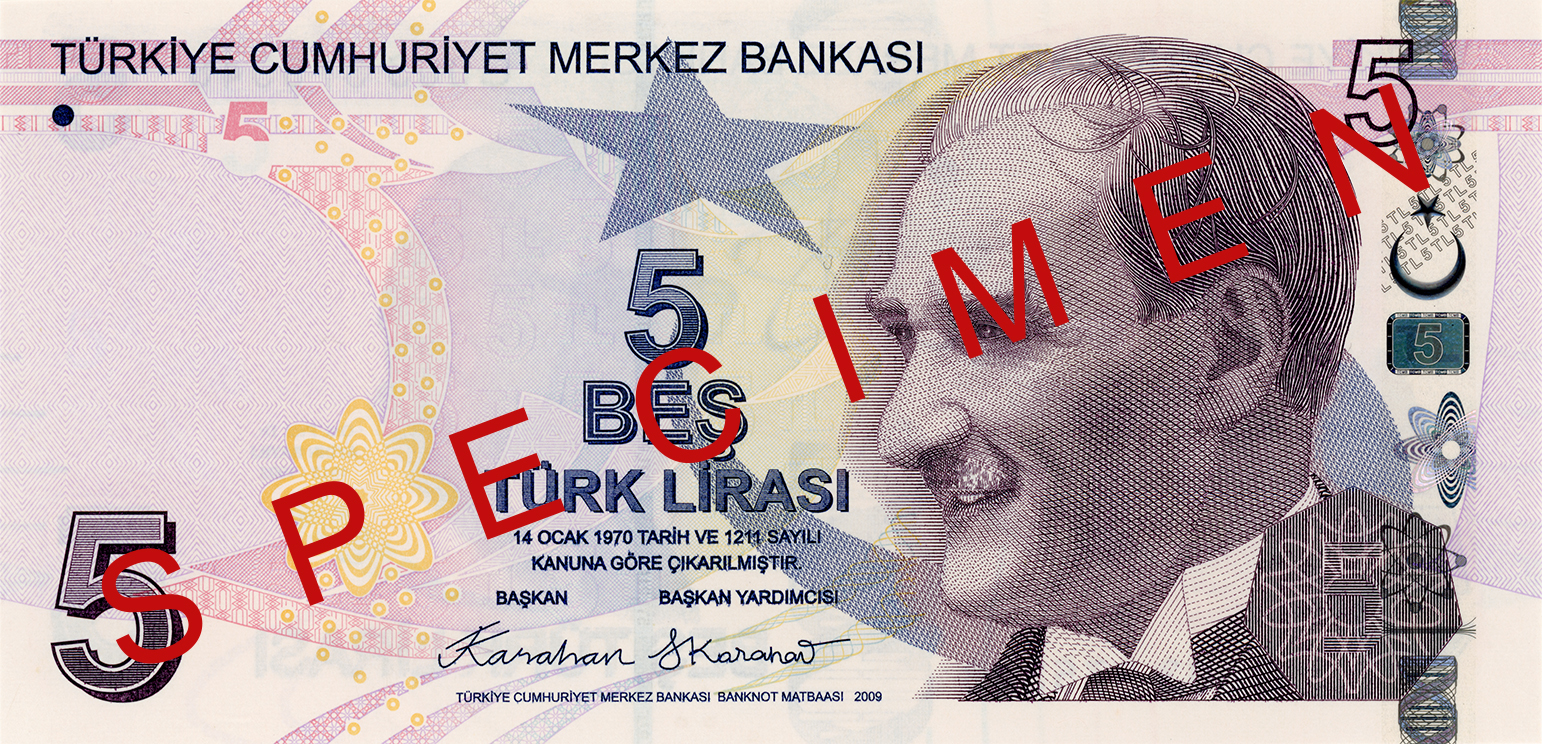 Gives different colour effects, shifting into a golden yellow. The denomination numeral "5" and the letters "TL" can be seen when the banknote is tilted.