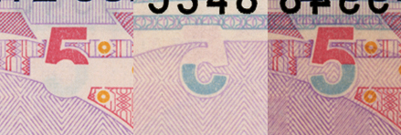 Concealed "5" can be seen when the banknote is tilted horizontally at the eye level.