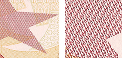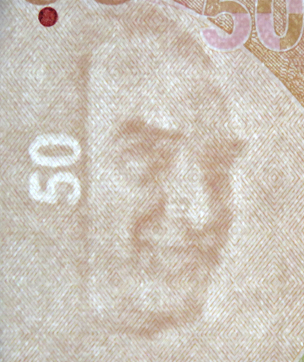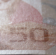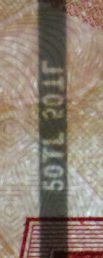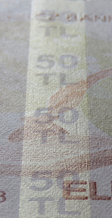 Banknot ışığa tutulduğunda, sol üst kenarda yer alan şekiller arka yüzdeki şekillerle birleşerek kupür değerini oluşturur.