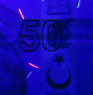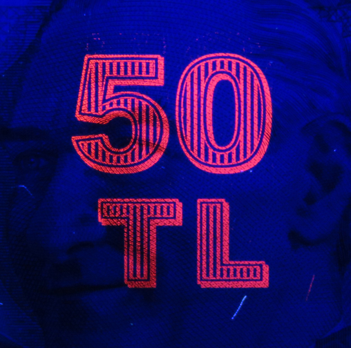 b) Banknot kağıdında bulunan ve normalde görülmeyen kılcal lifler UV ışık altında mavi ve kırmızı renkte parlama verir.
