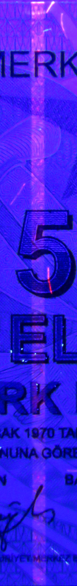 Banknot tasarımıyla uyumlu çeşitli motiflerden oluşur. Banknota farklı açılardan bakıldığında bu motifler renkli ve parlak yansımalar verir. Dikdörtgen şekil içindeki "TL" harfleri kupür değerine dönüşür.