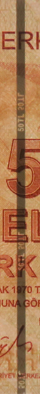 Kağıda gömülü olarak yer alır. Üzerinde "50" sayısı ile "TL" harfleri bulunur. Banknot ışığa tutulduğunda her iki yüzden de kesintisiz bir hat şeklinde görülür.