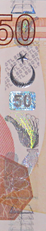 Banknotların ön yüzünde ay-yıldız motifin içindeki "50 TL" ibaresi ile holografik şerit folyo üzerindeki dikdörtgen şeklin alt ve üst kenarında "TCMB" ibaresi mikro yazılıdır.