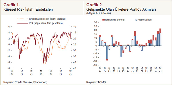2012 yılının son çeyreği, risk iştahındaki artış eğiliminin belirginleştiği bir dönem oldu (Grafik 1). Euro Bölgesi’ndeki sorunların çözümüne yönelik atılan somut adımların yanı sıra, ABD ve Çin ekonomisine dair olumlu haberler, risk algılamasındaki iyileşmeyi destekleyen başlıca gelişmeler olarak sıralanabilir. Öte yandan, gelişmiş ülkelerde büyüme görünümünün halen zayıf seyrini koruması nedeniyle miktarsal genişleme politikalarına devam edildiğini görüyoruz. Küresel ölçekte parasal genişlemenin sürmesi, risk iştahındaki artışla beraber gelişmekte olan ülkelere yönelik portföy akımlarında hızlanmaya neden oluyor (Grafik 2). Bütün bu gelişmelerin esnek bir politika çerçevesine sahip olmanın önemini bir kez daha ortaya koyduğunu düşünüyoruz.