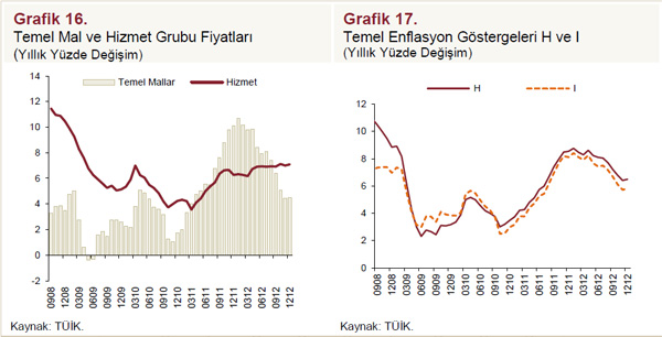 Döviz kuru ve ithalat fiyatlarında 2011 yılında gözlenen hareketlerin birikimli etkilerinin giderek azalması ve iç talepte süregelen yavaşlama sonucu, temel mal fiyatlarının yıllık artış oranı 2012 yılı boyunca gerilemeye devam etti. Hizmet fiyatları ise ılımlı seyrini korudu (Grafik 16). Bu gelişmeler çerçevesinde temel enflasyon göstergelerindeki düşüş eğiliminin sürdüğünü gözledik (Grafik 17).