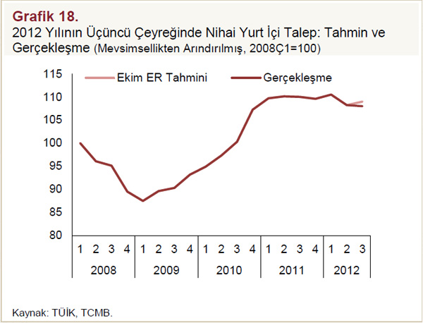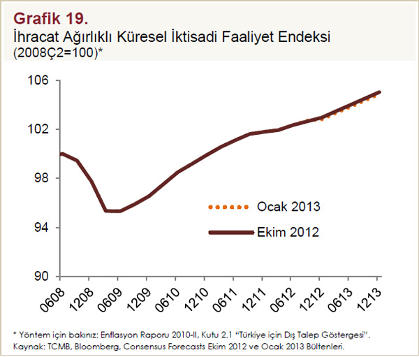 Öte yandan, son dönemde artan sermaye akımlarının finansal koşullar üzerindeki genişletici etkisinin desteğiyle 2013 yılının ilk yarısında yurt içi nihai talebin güçleneceğini tahmin ediyoruz. Sipariş göstergeleri, krediler ve diğer öncü endeksler de bu görünümü destekliyor. Bu doğrultuda, tahminlerimizi üretirken 2013 yılının ilk yarısında iç talebin bir önceki Rapor dönemine göre daha güçlü olduğu bir görünümü esas aldık.
