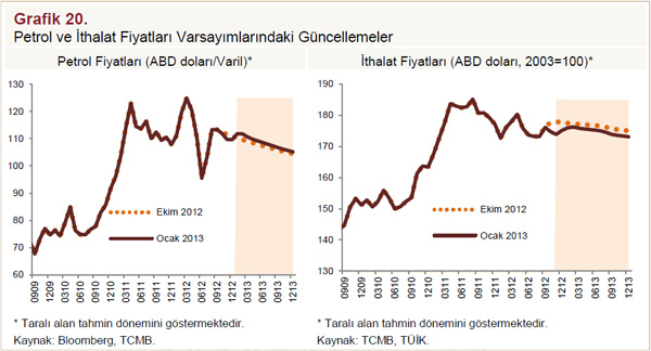 Ekim Enflasyon Raporu’nun yayımlanmasından itibaren geçen süre zarfında ithalat fiyatlarının görünümünde önemli bir farklılaşma olmadı (Grafik 20). Bir önceki Rapora kıyasla, 2013 yılı ortalama petrol fiyatı varsayımımızı sınırlı oranda yukarı yönlü güncellerken, ithalat fiyatları varsayımımızı bir miktar aşağı çektik (Grafik 20). Bu güncellemelerin 2013 yılı enflasyonu üzerinde kayda değer bir etkisi olmadığını belirtmek isterim. Öte yandan, gıda fiyatlarının yıllık artış oranına dair varsayımımızı bir önceki Raporda olduğu gibi yüzde 7 olarak koruduk. Diğer bir ifadeyle, temkinli bir yaklaşımla, işlenmemiş gıda fiyatlarının 2012 yılındaki olumlu seyrinin önümüzdeki dönemde devam etmeyeceğini varsaydık.