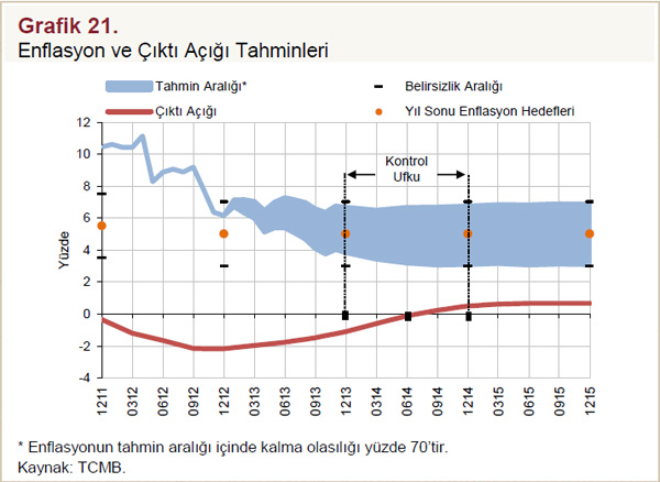 Tahminlerimizi oluştururken kredilerin yüzde 15 civarında büyüyeceğini ve reel efektif döviz kurunda önemli bir değişim gözlenmeyeceğini varsaydık. Bu çerçevede, enflasyonun, 2013 yılı sonunda orta noktası yüzde 5,3 olmak üzere yüzde 3,9 ile yüzde 6,7 aralığında gerçekleşeceğini tahmin ediyoruz. 2014 yıl sonu tahminimiz ise orta noktası yüzde 4,9 olmak üzere yüzde 3,1 ile yüzde 6,7 aralığında yer alıyor. Orta vadede enflasyonun yüzde 5 hedefi düzeyinde istikrar kazanacağını öngörüyoruz (Grafik 21).