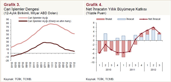 Olağanüstü bir küresel konjonktürden geçtiğimiz bu dönemde, Merkez Bankası’nın tasarladığı politika çerçevesi, küresel şokların yurt içine olumsuz etkilerinin sınırlanmasında büyük katkıda bulunuyor. Özellikle 2012 yılı, uygulanan politikaların etkisinin görülmesi bakımından önemli bir dönem oldu. Küresel ekonomide süregelen dengesizliklere rağmen bizim ekonomimizde dengelenme sürecinin belirginleştiğini ve büyüme kompozisyonunun giderek daha sağlıklı bir görünüme kavuştuğunu izledik. Yansıda da gördüğünüz gibi, cari işlemler dengesindeki iyileşme sürerken (Grafik 3) net ihracatın büyümeye katkısı belirgin şekilde arttı (Grafik 4). Özellikle, bu dönemde hem ihracatın hem de ithalatın büyümeye pozitif katkı verdiğini vurgulamak istiyorum.