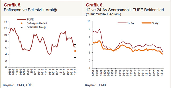 2012 yılı sadece makro finansal risklerin dengelenmesi anlamında değil, aynı zamanda fiyat istikrarı konusunda da önemli kazanımların elde edildiği bir dönem oldu. Yıl boyunca enflasyon aşağı yönlü bir eğilim sergileyerek bir önceki yıla göre 4,3 puan geriledi. Orta vadeli enflasyon beklentileri uzun bir aradan sonra ilk defa belirgin bir iyileşme sergiledi (Grafik 5 ve 6).