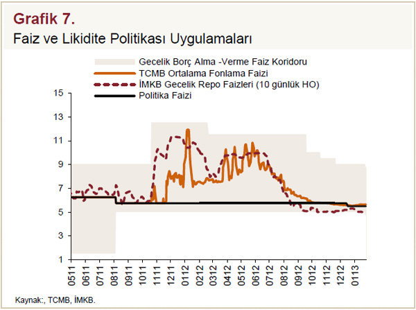 Enflasyonda ve dengelenme sürecinde arzu edilen sonuçların alınmaya başlamasıyla, 2012 yılının ortalarından itibaren para politikasını kademeli olarak daha destekleyici bir konuma getirdik. Bu doğrultuda, Haziran ayından itibaren piyasaya verdiğimiz likiditeyi artırarak ortalama fonlama maliyetini düşürdük (Grafik 7). Eylül ayından itibaren risk iştahındaki iyileşme ve Rezerv Opsiyonu Mekanizmasının daha etkili bir şekilde devreye girmesiyle faiz koridorunun üst sınırını kademeli olarak indirdik ve piyasaya verilen likiditeyi artırarak piyasa faizlerinin koridorun alt sınırına yakın seyretmesini sağladık.