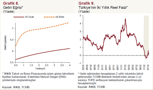 Risk iştahındaki artış ve uyguladığımız likidite politikalarına bağlı olarak yılın son çeyreğinde piyasa faizlerinde belirgin düşüşler yaşanırken, özellikle uzun vadeli faizlerdeki azalış daha fazla oldu. Bu gelişmeler sonucunda, yansıda da gördüğünüz gibi, getiri eğrisi bir önceki Rapor dönemine kıyasla her vadede aşağı kaydı ve eğimi yataylaştı (Grafik 8). Nominal faizlerdeki düşüşün enflasyon beklentilerindeki azalışa kıyasla daha belirgin olması nedeniyle yılın son aylarında reel faizlerde de kayda değer bir düşüş gözlendi. Yakın dönemdeki sınırlı artışa rağmen reel faizlerin tarihsel olarak düşük seviyelerini koruduğunu görüyoruz (Grafik 9).