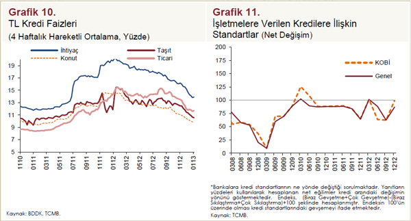 Yurt dışı finansman koşullarındaki rahatlamanın ve uyguladığımız likidite politikasının etkisiyle kredi faiz oranlarındaki düşüş yılın son çeyreğinde de sürdü. Piyasa faiz oranlarındaki azalışa paralel olarak tüketici kredisi faizlerindeki aşağı yönlü eğilim sürerken, faiz koridorunun üst sınırındaki indirimlerin etkisiyle yılın son çeyreğinde ticari kredi faizlerindeki düşüş belirginleşti (Grafik 10). Ayrıca, bu dönemde işletmelere verilen kredilerin standartlarındaki sıkılaşmanın da durduğunu görüyoruz (Grafik 11).
