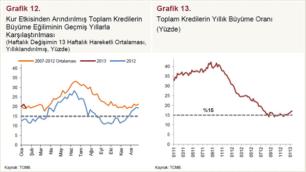 Bu gelişmeler sonucunda yılın son çeyreğinde krediler tekrar ivmelenme eğilimine girdi (Grafik 12). Böylece, yıl sonunda toplam kredilerin büyüme oranı orta vade için referans alınan yüzde 15 seviyesinin sınırlı ölçüde üzerinde, yüzde 16 civarında gerçekleşti (Grafik 13). 2013 yılının başı itibarıyla toplam kredilerin oldukça güçlü seyrettiğini ve 13 haftalık artış eğiliminin geçtiğimiz yılların ortalamasına yakın olduğunu görüyoruz.