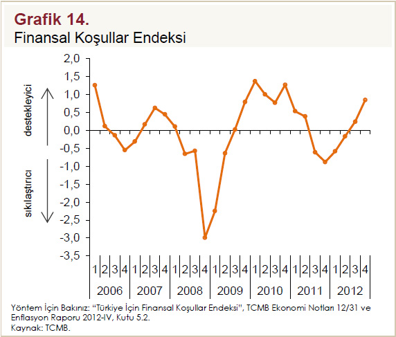 Önümüzdeki dönemde kredilerin daha da ivmelenmesi riski bulunuyor. Nitekim, sermaye akımlarındaki hızlanma, faiz oranlarındaki düşüş ve kredi koşullarındaki iyileşme ile finansal koşullar endeksinin artmaya devam ettiğini görüyoruz (Grafik 14). Bu görünüm, önümüzdeki dönemde makro-finansal risklere dair temkinli duruşun korunmasını gerektiriyor. Bütün bu değerlendirmeler sonucunda, 2013 yılının ilk Para Politikası Kurulu toplantısında, kredilerdeki öngörülenin ötesinde gerçekleşen artışa dikkat çekerek söz konusu eğilimin sürmesi halinde makro ihtiyati tedbirlere devam edeceğimizi belirttiğimizi hatırlatmak istiyorum.
