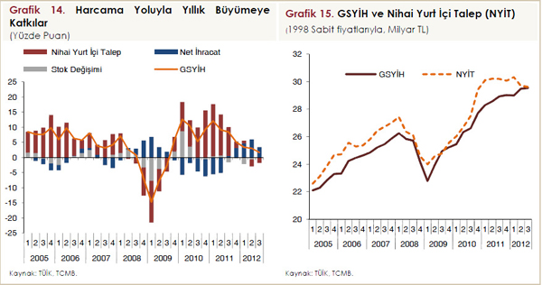 45. 2012 yılının başlarından itibaren küresel risk iştahı kademeli olarak iyileşme eğilimine girerken, ekonomideki dengelenme süreci belirginleşmiştir. Bu dönemde uyguladığımız para politikası ve alınan makro ihtiyati tedbirlerin kredi büyümesini yavaşlattığından ve Türk lirasındaki aşırı değerlenmenin giderildiğinden bahsettik. Bu gelişmeler büyüme kompozisyonunun net ihracat lehine değişmesini sağlamıştır. 2011 yılının ikinci yarısından itibaren yurt içi nihai talep yatay bir seyir izlerken net ihracatın katkısındaki belirgin artış ile GSYİH büyümeye devam etmiştir Böylelikle, ekonomi dengelenme sürecine girmiş ve makro finansal riskler sınırlanmıştır.