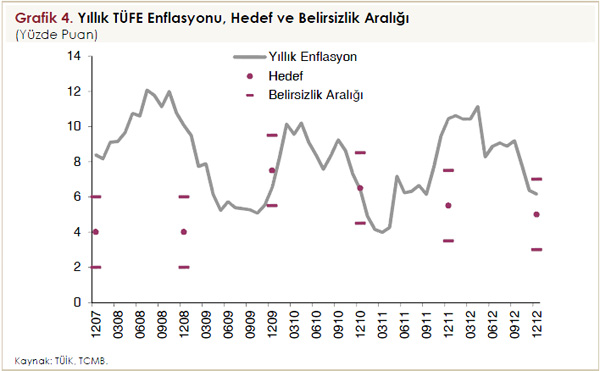 50. 2012 yılı boyunca büyük ölçüde yatay seyreden orta vadeli enflasyon beklentilerinin yılın son döneminde azalış eğiliminde olduğunu gözlemlemekteyiz. Yılın ilk bölümünde tüketici enflasyonunun yüzde 10'un üzerinde seyretmesine karşın enflasyon beklentilerinde bir bozulma olmamasını para politikasının etkinliği açısından olumlu olarak değerlendirmekteyiz.