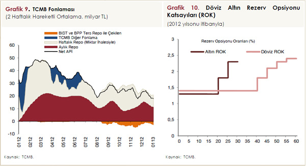 34. Öte yandan, petrol fiyatları ve diğer maliyet unsurlarında gözlenen artışların enflasyon beklentilerini bozmasını engellemek amacıyla 23–29 Mart 2012 tarihleri arasında ek parasal sıkılaştırmaya gittik. Bu dönemde politika faizinden yapılan bir hafta vadeli repo fonlama miktarını düşürerek piyasaya sağlanan likiditenin ağırlıklı ortalama faizini yükselttik. 2012 yılı Mart ayı PPK toplantısında Türk lirası yükümlülükler için zorunlu karşılıkların altın cinsinden tutulabilme oranını yüzde 10'dan yüzde 20'ye yükselttik.