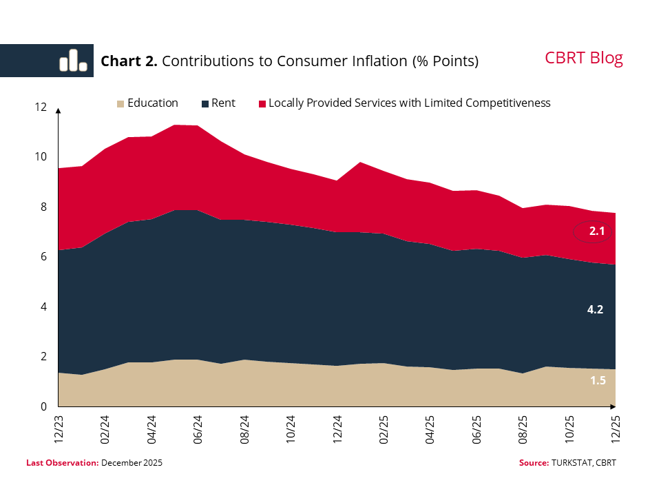 To conclude, the education, rents and locally provided services items with limited competitiveness stand out as the key sub-items in the high course of service inflation in 2025. We expect that the latest regulatory change in education will contribute to the disinflation process by relatively weakening the backward indexation mechanism. On the rents front, both the seasonally adjusted price data and leading indicators for rents point to a downward underlying inflation. However, price increases in locally provided services items with limited competitiveness such as urban transport, barbers/hairdressers, household cleaning and dry cleaning may involve rigidities that can be attributed to income expectations, market structure, and pricing behavior, in addition to cost and demand factors. These rigidities are among the factors that affect the course of inflation and challenge the disinflation process.