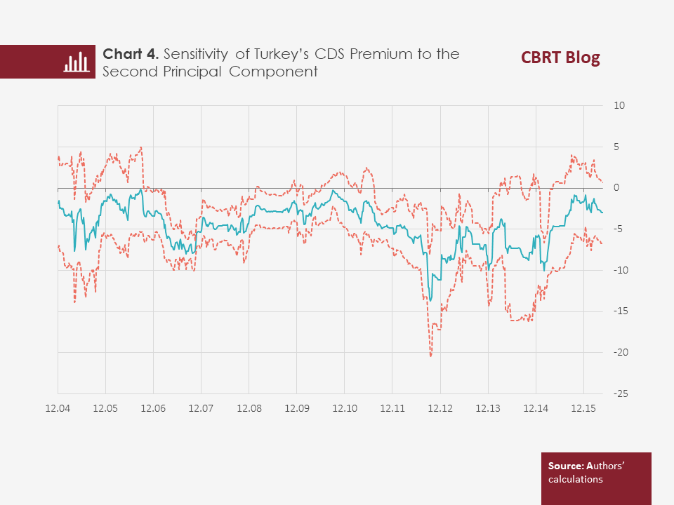 In the second step, the sensitivity of changes in each country’s credit risk premium to principal components is calculated via rolling regressions. In this way, the sensitivity of countries to common risk factors is analyzed. While the sensitivity to the first risk factor takes positive values for all countries during all episodes, the sensitivity to the second risk factor changes sign over time. Since the sensitivity to the first risk factor takes the same sign for all countries, this variable can be considered a global risk factor. Turkey’s sensitivity to the global risk factor is also found to increase during crisis times, with the confidence band getting narrower.