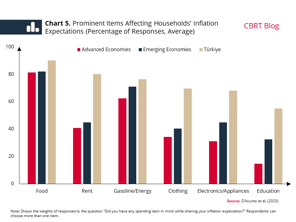 Inflation expectations play a significant role in inflation dynamics, as they influence multiple channels, including consumption and saving decisions, portfolio preferences, and pricing behaviors. In line with its primary objective of price stability, the Central Bank of the Republic of Türkiye (CBRT) employs the inflation expectations of economic agents as a key input in policy formulation. In this blog post, we examine the role of perceived inflation, prominent items in the consumer basket, and central bank communication in shaping household expectations through a comparative lens of global examples.