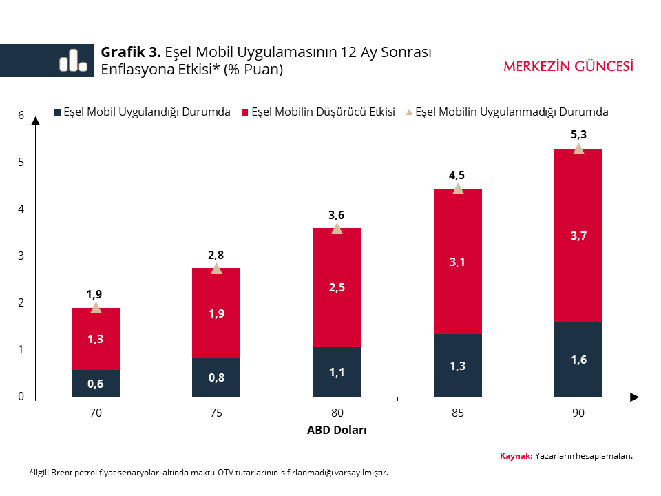 2026 yılının ilk Enflasyon Raporu’nda Mart 2026-Şubat 2027 arası ortalama Brent petrol fiyatı 58,8 ABD doları olarak varsayılmıştı. Analizimizde, ortalama Brent petrol fiyatının önümüzdeki 12 ay sürecinde (Mart 2026-Şubat 2027) 70 ila 90 ABD doları arasında değiştiği alternatif senaryoları ele alıyoruz (Grafik 3). Ortalama Brent petrol fiyatının 70 ABD doları olduğu, Brent petrolden ürün fiyatlarına geçişkenliğin birebir varsayıldığı ve eşel mobil uygulamasının olmadığı durumda, 12 aylık bir dönem sonunda yıllık enflasyon tahmini 1,9 puan yukarı yönlü etkileniyor. Eşel mobil uygulaması enflasyondaki doğrudan ve dolaylı artışların 1,3 yüzde puan daha düşük, bir başka ifadeyle yüzde 0,6 olarak gerçekleşmesini sağlıyor. Eşel mobilin enflasyonu düşürücü etkisi Brent petrol fiyatının ortalama 90 ABD doları olduğu durumda 3,7 yüzde puana kadar çıkıyor.