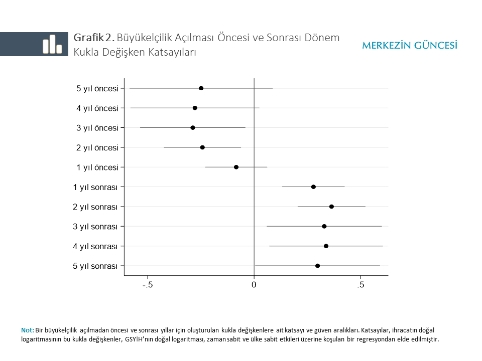 Bununla birlikte, panel veri analizinde dahi, yeni büyükelçilikler ekonomik büyüme eğiliminin güçlü olduğu ya da ihracat eğiliminin zaten pozitif olduğu ülkelerde açılmışsa, bulunan etkinin yansızlığını iddia etmek mümkün olmaz. Ters nedensellik ilişkisi olarak adlandırılan bu sorunun var olup olmadığını teşhis etmek amacıyla basit bir regresyon testi yaptık. Büyükelçilik açılmasından öncesi ve sonrasındaki 5’er yıllık dönemdeki her bir yıl için kukla değişken oluşturarak bunların ihracatın doğal logaritması üzerine etkisini regresyon denklemi ile tahmin ettik. Bu testten elde edilen kukla değişkenlerin katsayı ve güven aralıkları Grafik 2'de görülebilir. Katsayıların, büyükelçilik açılmasından önce pozitif bir eğilime sahip olmaması, ters nedensellik ilişkisinin olmadığını öneriyor.