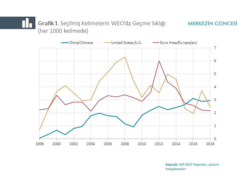 Çin’in dünya ekonomisi açısından artan önemini göstermek için biraz farklı bir yönteme başvurduk ve IMF’nin yılda iki defa yayımlamakta olduğu “Küresel Ekonomik Görünüm” (World Economic Outlook- WEO) raporlarında Çin’den hangi sıklıkta bahsedildiğini değerlendirdik. Grafik 1’de de görülebileceği gibi, son 20 yıllık süreçte WEO raporlarında Çin’in ağırlığı –Küresel Finans Krizi dönemi hariç- sürekli olarak artmakta. Nitekim 2014-18 döneminin ortalamasına bakıldığı zaman WEO içerisindeki metin ve grafiklerde Çin’in, ABD ve Euro Bölgesi/Avrupa’dan daha sıklıkla anıldığını görmekteyiz1